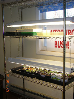 The lights setup I have is shown in the image - it works really well. It's a large, four-shelf shelving unit, and the metal slats are perfect for hanging fluorescent lamps on. I have enough lamps (4) for only two of the shelves to be functional for growing. I put two lamps side-by-side so the plants get complete coverage. I could improve the light distribution by using aluminum foil as sort of a curtain over each of the lamps to reflect the light back to the plants, but I haven't gotten it that much together. I have all the lights on timers, and they're on from about 6AM to 10PM, so 16 hours. Believe it or not, plants need the night time hours to do their own thing (they don't really rest, they actually do plant activities, whatever those are); what I've read is that they should be in the dark at night, just like we are!